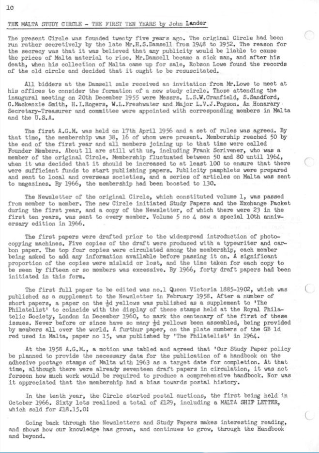 The first Malta Study Circle was founded by a small group of enthusiasts in 1948 but did not last. Robson Lowe successfully revived the Circle, when six collectors met at Robson Lowe's auction rooms on 20th December 1955. Since then the Circle has published nearly fifty study papers and over twenty volumes of newsletters, as well as providing the information for the handbook. Nevertheless new information is continually coming to light. Below is an extract from the 1980 Newsletter Volume 10 No 1 by the late John Lander which describes in more detail the events that led to the formation of the circle. This is poiniant time to include this reference as this year (2019) saw the passing of our President John Lander a life long member from those early days.